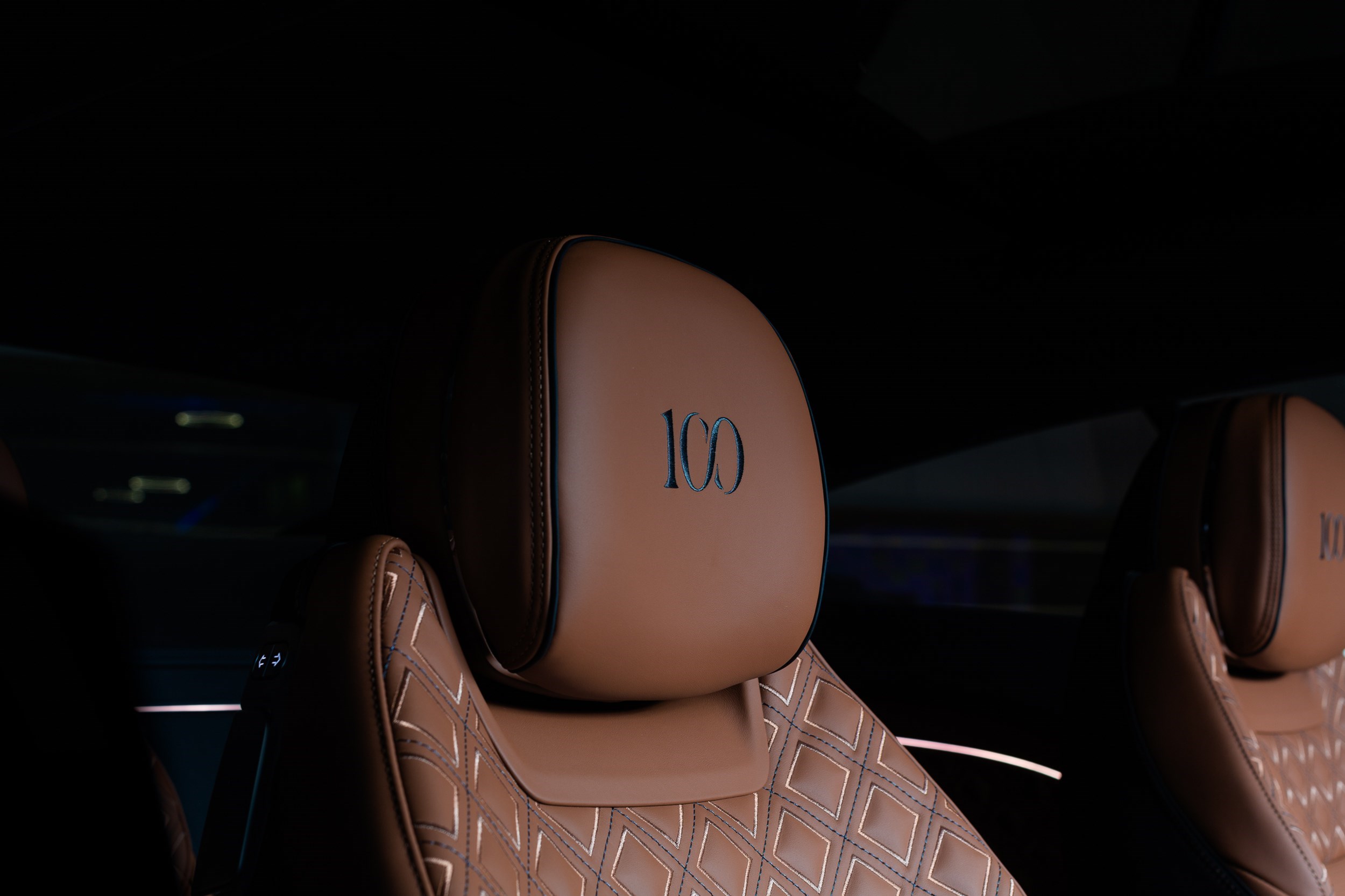 Inside each exquisitely appointed cabin, the 100 Anniversary Collection cars are crafted with Cognac main hide and Beluga secondary hide, with Diamond Quilt contrast stitching. Personalised embroidered ‘100’ headrest emblems adorn the seats, while Piano Black over Copper Stone dual finish veneer complements the dashboard and doors, with Diamond Knurling Specification to brightwork as standard.