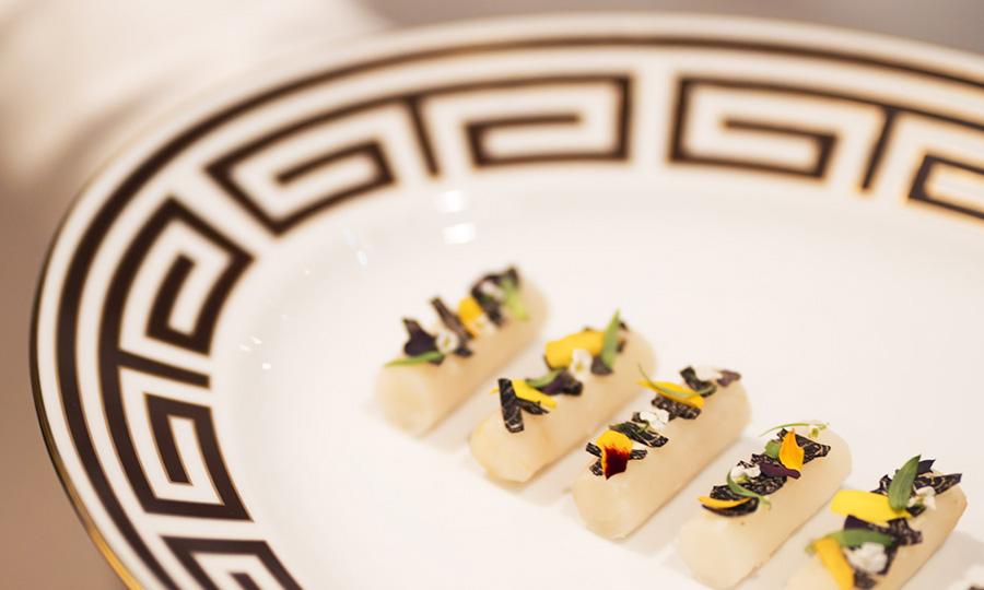 Ginori 1735 enhanced the event by showcasing its iconic Labirinto collection, designed in 1926 by Gio Ponti, then the Maison’s artistic director. Its graphic motif — straight lines that intertwine without ever touching — creates a hypnotic dynamic where heritage meets modernity. Presented in brown and cashmere, the Labirinto design adorned plates, cups, trays, and bowls, offering a refined setting for the evening.
